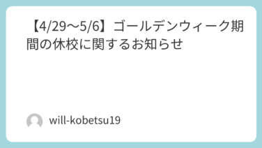 【4/29~5/6】GW休校期間に関するお知らせGW期間の休校についてお知らせいたします。誠に勝手ながら、以下の期間を休校とさせていただきます。【休校期間】 4月29日(水)~ 5月6日(水)■ご注意点 上記期間内は、通常授業はすべてお休み...