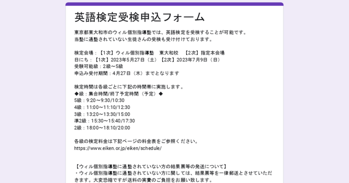 ・今年度よりウィル個別指導塾に通塾されていない方に関しては、結果票等を一律郵送とさせていただきます。大変恐縮ですが送料の実費のご負担をお願い致します。