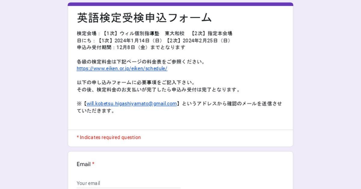 現在、ウィル個別指導塾は定期テスト対策、受験生対応の為、各種検定に関するお電話でのお問い合わせに対応が難しくなっています。