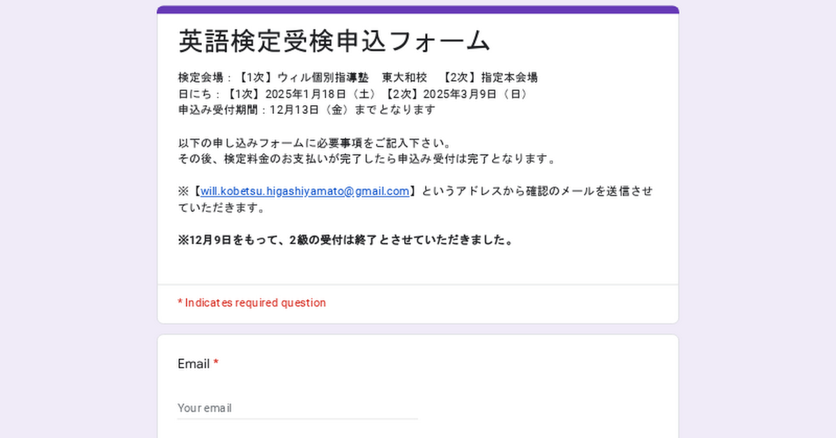 検定会場:【1次】ウィル個別指導塾 東大和校 【2次】指定本会場日にち:【1次】2025年1月18日(土)【2次】2025年3月9日(日) 申込み受付期間:12月13日(金)までとなります以下の申し込みフォームに必要事項をご記入下さい。その...
