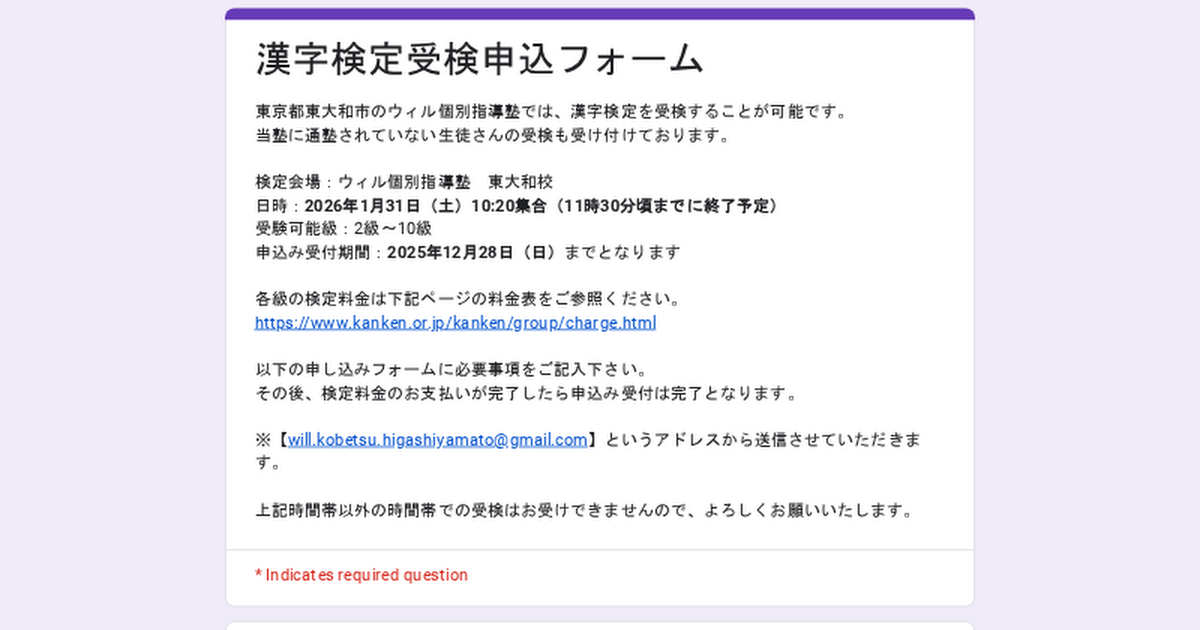 東京都東大和市のウィル個別指導塾で実施する英語検定の申込みフォームになります。検定会場:【1次】ウィル個別指導塾 東大和校 【2次】指定本会場日にち:【1次】2026年1月18日(日)【2次】2026年3月8日(日)申込み受付期間:2025...